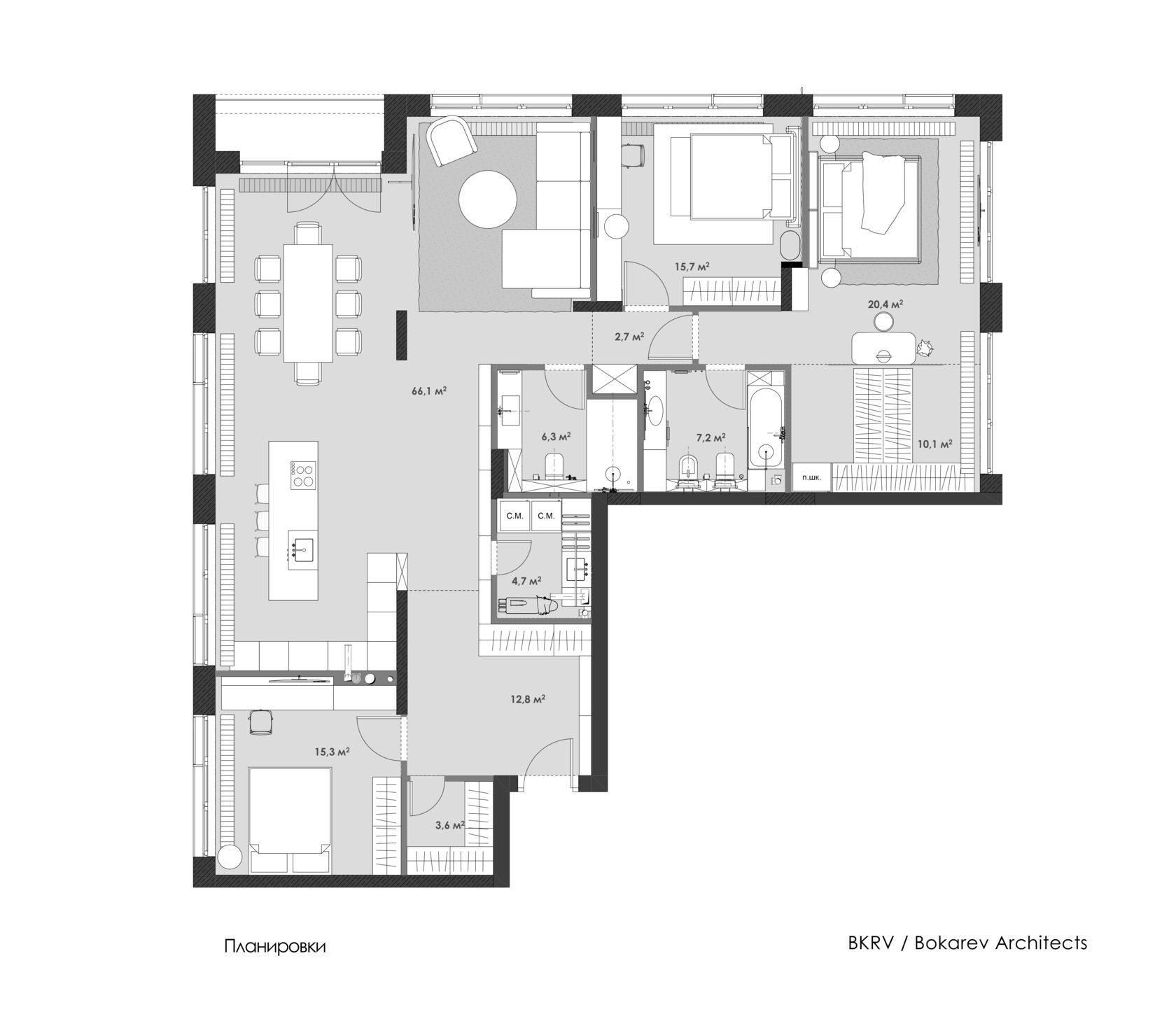 Проект сдержанного и элегантного интерьера трехкомнатной квартиры.